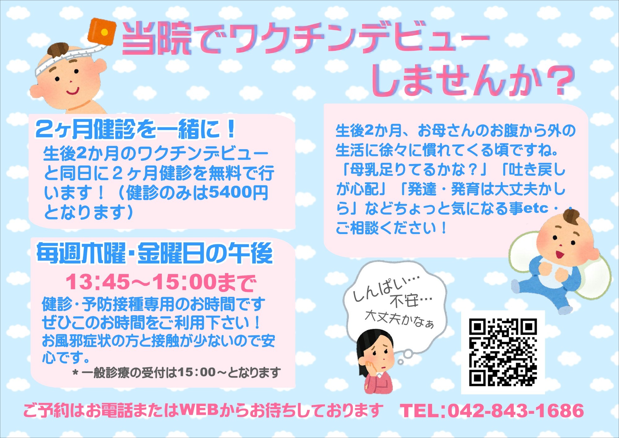 当院ではワクチンデビューと同日に「生後2ヵ月健診」を無料で行っております。ぜひご利用下さい!